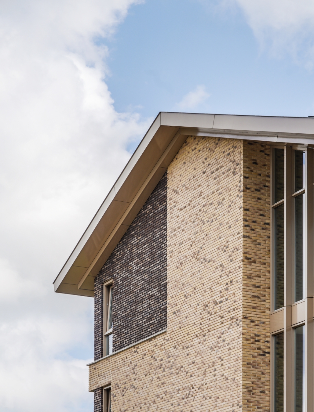 Het was de kunst om deze nieuwbouw mooi in te passen tussen enerzijds de bestaande dorpsbebouwing en anderzijds het landschap rondom Voorthuizen. We denken dat dat mooi gelukt is door aardse tonen te gebruiken in de materialen en kleuren, zoals de rieten kappen en de houten elementen in de gevels. Dat past bij de bestaande bebouwing en contrasteert mooi met het landschap eromheen.
