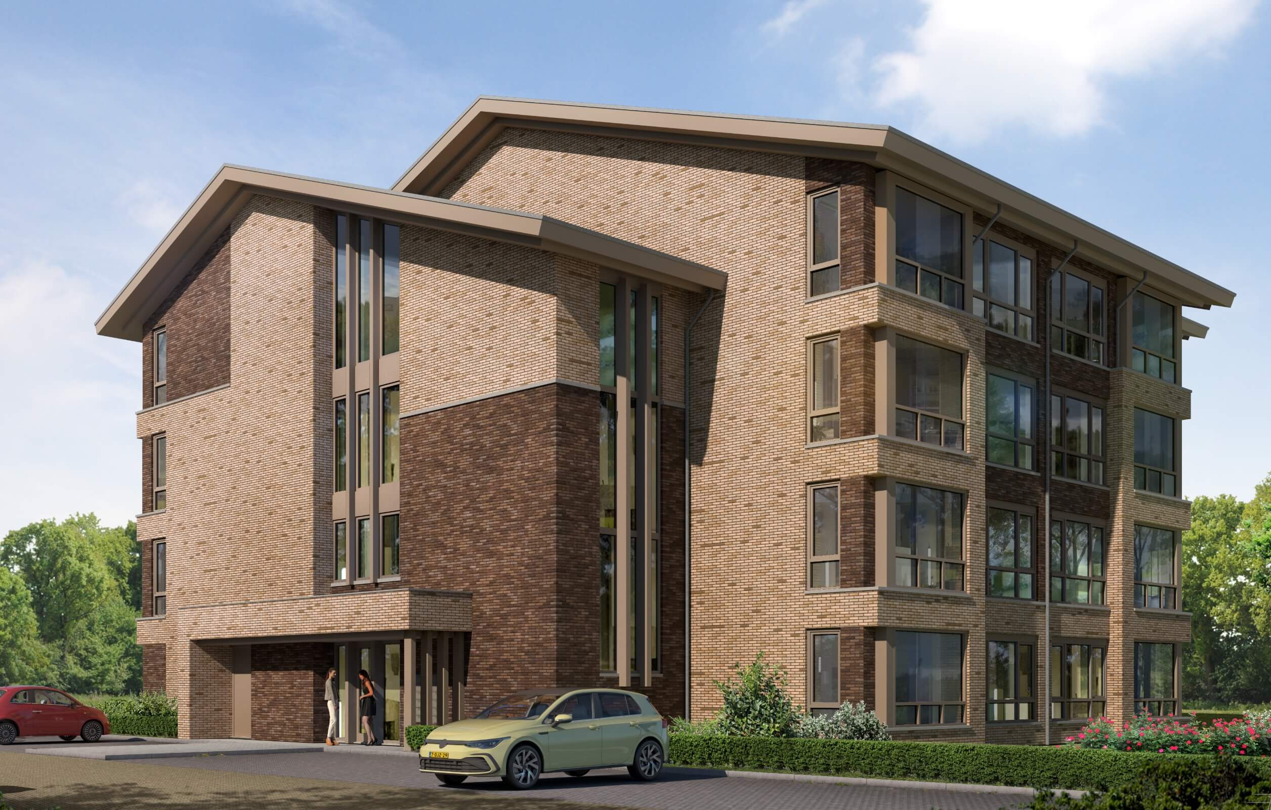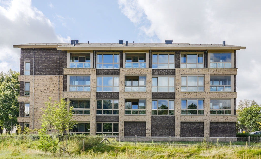 Het plan is opgedeeld in drie woongebieden, waarbij in het meest oostelijk gelegen gebied, het appartementengebouw de ‘kop’ van het plan accentueert en daarmee de nieuwe entree van Voorthuizen vormt. Daarachter ligt een gebied met 24 rijwoningen, met daar weer achter (aansluitend op de bestaande bebouwing van Voorthuizen) een mix van twaalf halfvrijstaande woningen. We hebben vanaf de start van het ontwerpproces de appartementen naar buiten willen richten waarbij het zicht op het omliggende landschap wordt gericht. Dit in tegenstelling tot het weren van de geluidbelasting vanuit het wegverkeer, waarbij we juist voor een introvert gebouw zouden kiezen. Daarom is ervoor gekozen om de compacte appartementen elk te voorzien van beglaasde buitenruimten. Deze buitenruimten zijn vormgegeven als erker-elementen en dienen als geluidbuffer tussen de omgeving en het interieur van de appartementen.
